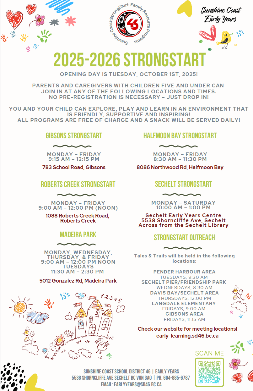 SD46 is excited to offer StrongStart to our families. This free program offers a warm and welcoming space to support playful connections between young children and their families and caregivers. The program is designed specifically for children from birth to pre-kindergarten with a focus on connection, play and early development.